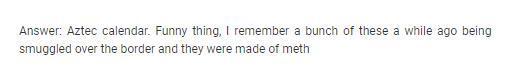 “阿兹特克人的日历。很搞笑,我记得前阵子刚有一批这东西被走私进来,然后发现全是冰毒做的......”