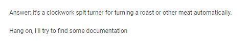 “这是个发条驱动的旋转器,你可以把它转进壁炉里自动烤肉啥的。”