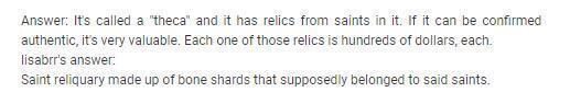 “这东西叫‘theca’,里面放着的是(基督教)圣人的遗物。如果能确认是真的,那么里面的每一个遗物都值好几百刀。”