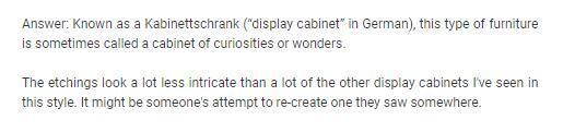 “与我见过的很多这种类型的展示柜相比,你这个的蚀刻看起来会简单很多,可能是某人试图复现他们在别处看到过的原版。”