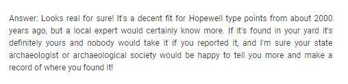 “看着很真!比较像大概两千年前的Hopewell型箭头,但你们当地的专家肯定会知道更多。。如果是在你家后院发现的,就肯定是你的,如果你上报了,没人会拿走的。”