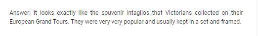 “在维多利亚时代,人们进行欧洲环旅时就很爱买这种凹雕纪念品,你这个看起来跟它们一模一样。当年这东西可流行了,一般都是成套裱起来的。”