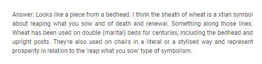 “看着像床头的一部分。我认为上面的小麦是某种基督教象征,春播秋收呀、死亡与更新呀,总之就是这类含义。”