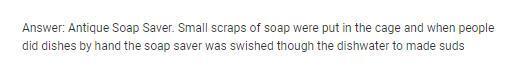 “这个是古董肥皂盒,为了节约,肥皂用到很小块之后就放这个笼子里,拿来洗碗。放它在水池里涮一涮,很快就起沫了。”