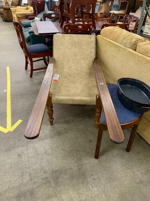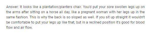 “看着像是种植园椅。你骑了一整天的马,腿又酸又肿,此时就可以把腿抬起来,放在这两个扶手上,就像是孕妇会做的那样。”