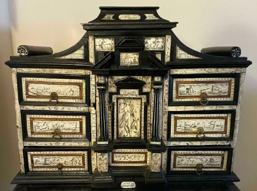 “巨大的德国古董箱子。据说已经在我家传了好多代了。它是由深黑色的木材跟象牙制成,面板上有蚀刻装饰,内部是好多个抽屉。”