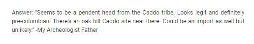 “貌似是一个Caddo部落的垂头雕像。看着应该是真的,而且绝对是哥伦布时代之前的。橡树山那边的确有个Caddo部落的遗址。但也可能是进口的,不过可能性不高。——来自我的考古学家父亲。”