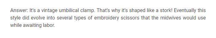 “这是个老式的脐带钳,所以它形状很像鹳!最终,这种风格又演变成了另外几种脐带剪的样式,供助产士们使用。”