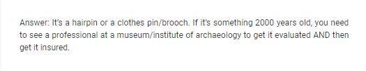 “这是个发夹、衣夹或者胸针一类的东西。如果真有两千年历史,你得赶紧去博物馆、考古研究所之类的地方找专业人员鉴定,然后给它上保险。”