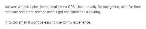 “确实,这是星盘,古人的GPS。一般都用来导航,有时候也会用于测量或者其他的科学用途。我有个差不多的,拿来当钥匙链了。”