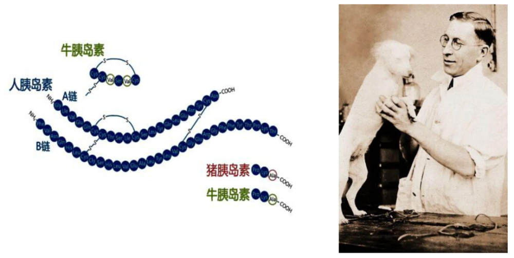(1)动物胰岛素:动物胰岛素由加拿大人班廷和拜斯特首次发现,在1922年应用于临床,主要是从牛和猪的胰腺中提取,其中猪的胰岛素与人的胰岛素结构较为相似,但在β链羧基端的一个氨基酸不相同。因此动物胰岛素极易激活人体的免疫反应,较易出现局部的过敏反应。临床上常用的有中性胰岛素、精蛋白胰岛素等。