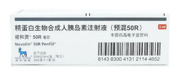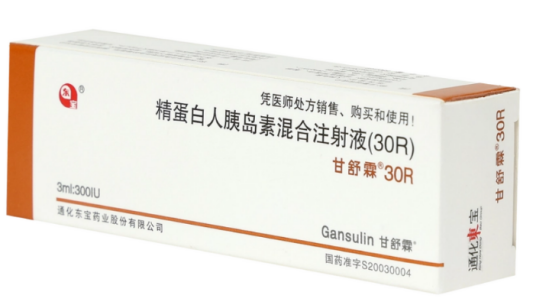 (5)预混胰岛素:即将短效胰岛素和中效胰岛素或者速效胰岛素和中效胰岛素按一定比例进行混合而组成。其既有短效或速效胰岛素的特点(起效快),又有中效胰岛素的特点(维持时间较长),临床既能控制餐前血糖又能控制餐后血糖,常用的有精蛋白生物合成人胰岛素30R、50R,精蛋白锌重组人胰岛素30R,50R,门冬胰岛素30R等。其中30R是指将30%的短效R与70%N胰岛素混合;50R是指短效R和中效N各占50%。