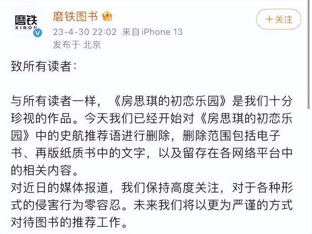 史航事件发生后,磨铁图书立马在微博发布公告声明,于4月30日开始着手对《房思琪的初恋乐园》中的史航推荐语进行删除,并声明《房思琪的初恋乐园》是十分珍视的作品,对各种形式的侵害行为零容忍。