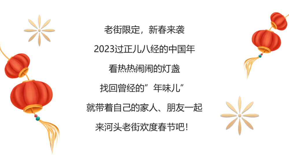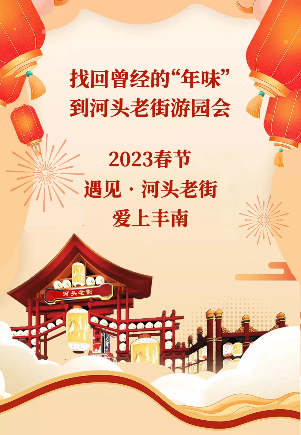春节期间,河头老街特别策划以“遇见河头老街·爱上丰南”为主题的春节游园活动,以象征平安和吉祥的“兔爷”为主形象。同时依托项目资源特色及禀赋,有针对性地筹划了为古风古韵、微演绎、NPC真人秀、花灯展示、民俗表演、非遗展示、冰雪运动、美食体验、沉浸体验、互动美陈十大主题活动。为游客献上一场极具观赏性、娱乐性及参与性的饕餮盛宴。