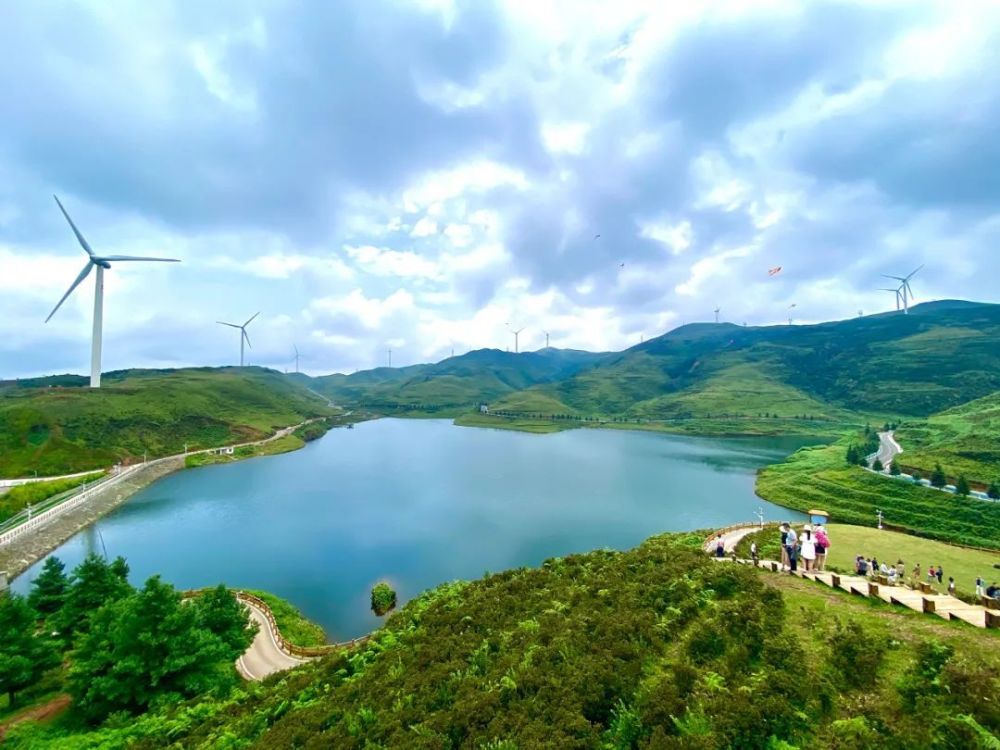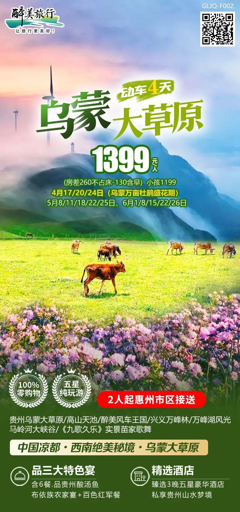 贵州乌蒙大草原、高山天池、醉美风车王国、兴义万峰林、万峰湖风光、马岭河大峡谷、《九歌久乐》实景苗家歌舞、田州古城、品贵州酸汤鱼宴+布依族风味宴 动车4天超豪团