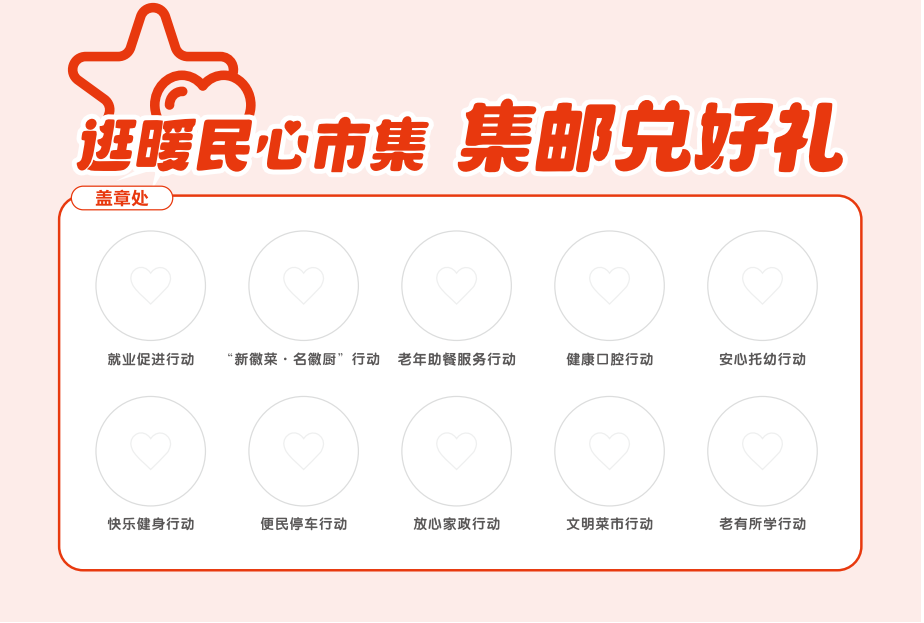 本次市集共设有就业促进行动、“新徽菜 名徽厨”行动、老年助餐服务行动、健康口腔行动、安心托幼行动、快乐健身行动、便民停车行动、放心家政行动、文明菜市行动、老有所学行动10个互动展区。
