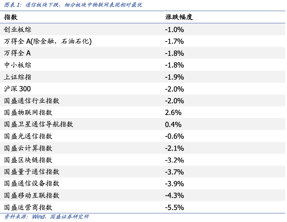 二、行情回顾:通信板块表现下跌,物联网表现最佳