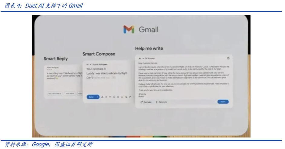 谷歌紧追行业脚步,推出对标微软Copilot的Duet AI,Bard进行全面升级。1)Duet AI赋能谷歌办公套件Docs、Sheets、Slides、Meet和Gmail,为其带来全新AI助理升级。2)Bard增加了许多新功能,例如支持日语和韩语,还有新的暗模式和可视化搜索功能。谷歌计划未来添加更多功能:使用Adobe的AI图像生成器Firefly的AI图像生成,以及与OpenTable和Instacart等第三方服务的集成。3)此外,谷歌AI搜索也进行了更新,帮助用户在搜索时提供更多上下文参考。4)边缘侧,谷歌正在将AI功能加入Android系统,例如帮助用户生成短信回复候选词句、AI创建壁纸、图片编辑等。