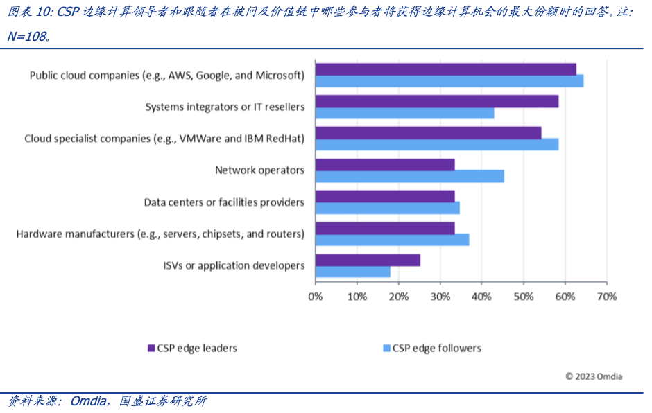 电信运营商意识到了这一点。Omdia最近发布的《2023年CSP网络边缘调查:美国和英国部署、驱动力和挑战》报告显示,美国和英国的CSP认为公有云玩家和系统集成商最有可能成为边缘计算的赢家。