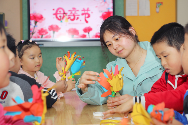 5月11日,安徽省六安市金安区光明南苑幼儿园开展“童心报春晖 爱在母亲节”主题活动,小朋友们在老师的指导下用彩色卡纸等手工制作花束,并将花束送给自己的妈妈,表达对母亲的爱,让感恩的种子在他们的小小心田生根发芽。中国教育报-中国教育新闻网通讯员 田凯平 摄