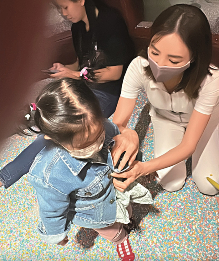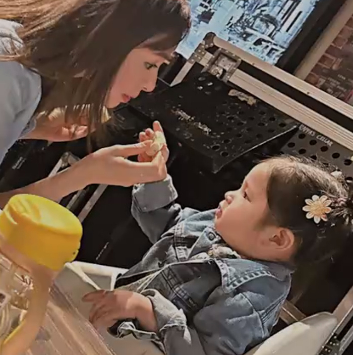 接着女儿上完课后她们母女俩又马不停蹄继续去其他地方,谭凯琪先带女儿到旁边的餐厅吃饭,她细心喂女儿吃饭。接着她就奖励女儿这么乖巧上完课,她带着女儿去儿童游乐场玩耍。女儿在里面很活泼,至于谭凯琪则在旁边看着或者和女儿一起玩,她一直留意着女儿的身体情况,给女儿穿衣保暖。
