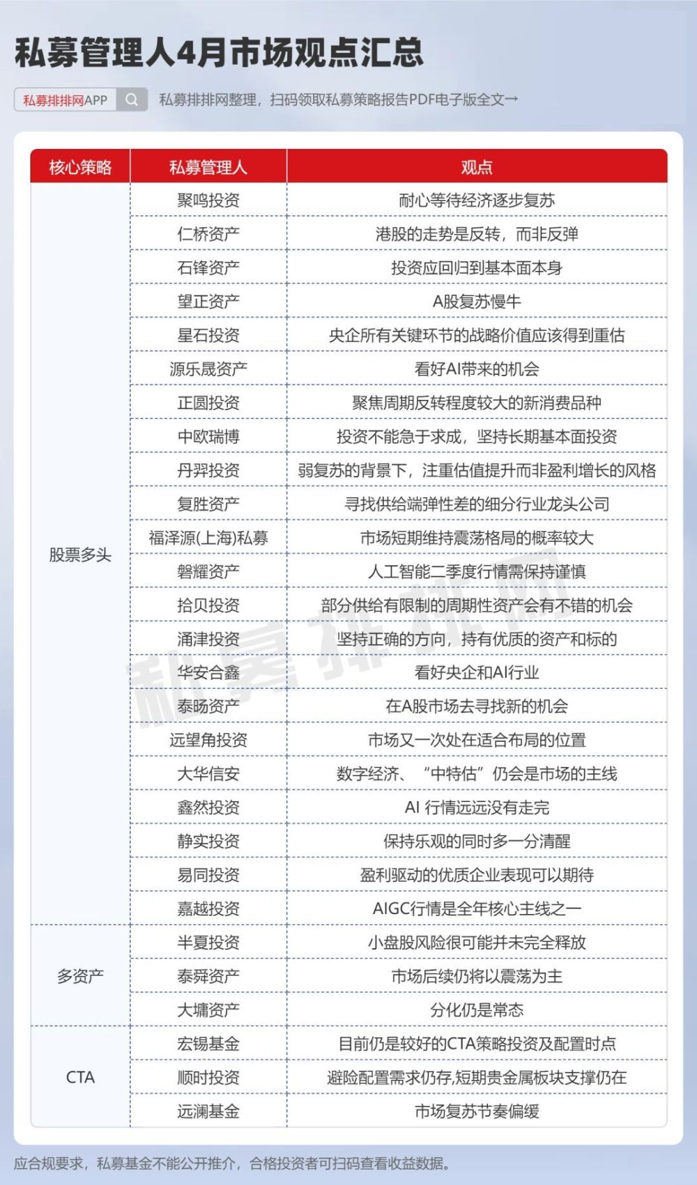 AI与“中特估”两大核心题材将如何轮动?就5月行情展望,看好的投资方向,以及市场风险点提示,排排网财富及时向私募管理人收集了最新的月度策略,以下为私募最新观点汇总: