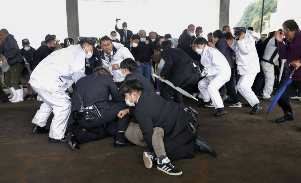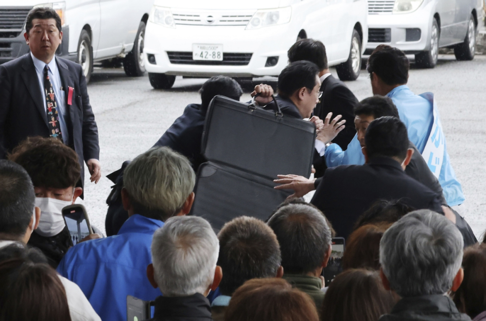 4月15日,岸田文雄在参加选举活动时,突然从人群中飞出一枚银色管状物,落在岸田的脚边。