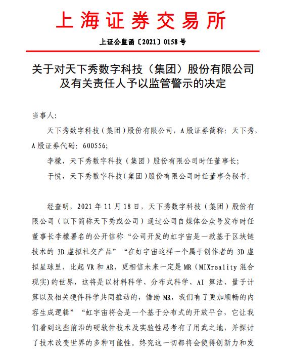 之后,上交所对天下秀及时任董事长李檬、时任董事会秘书于悦予以监管警示,认为其信息可能对投资者形成误导。经监管督促,公司披露公告称,公司并未参与AR、VR、MR 及相关硬件技术研发,亦无相关硬件技术储备或专利,目前虹宇宙产品也尚未接入前述硬件技术。虹宇宙作为实验阶段产品有较大的风险和不确定性。