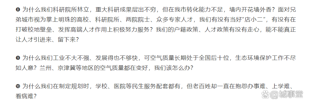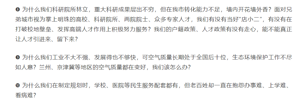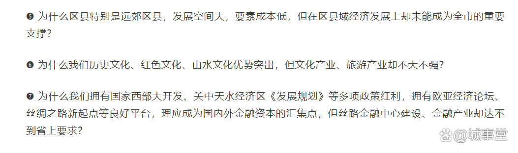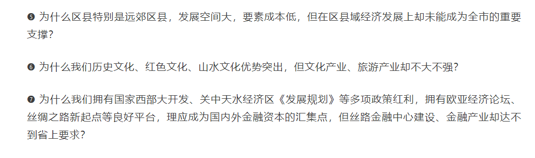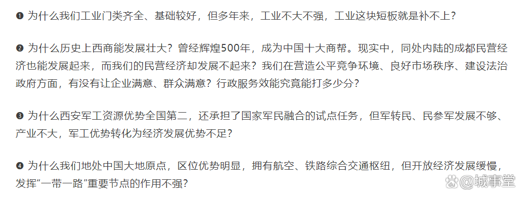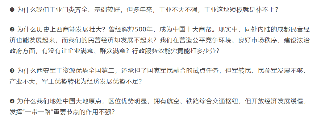经济发展不起来、作为十三朝古都,西安旅游业多年不见起色、办事拖沓,营商环境差等等,这些都让他痛心疾首。