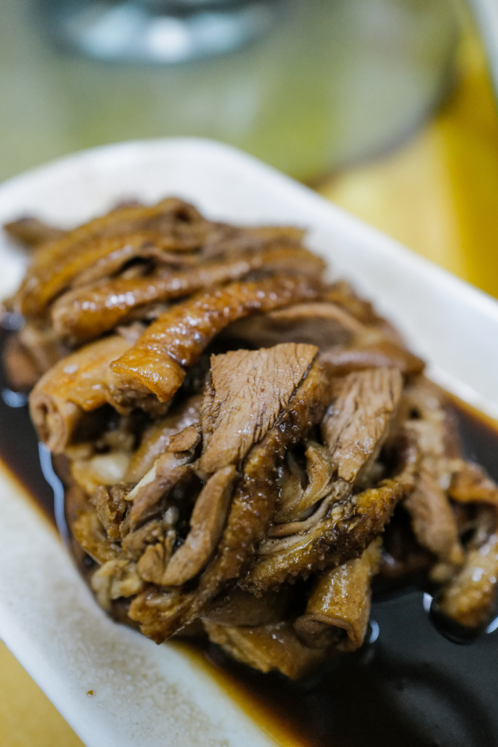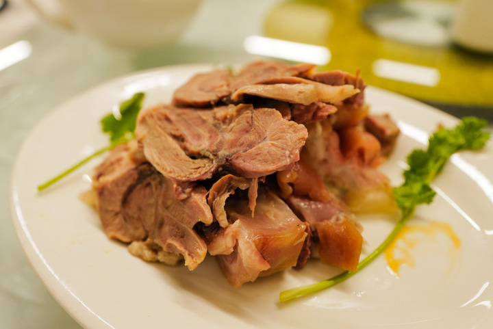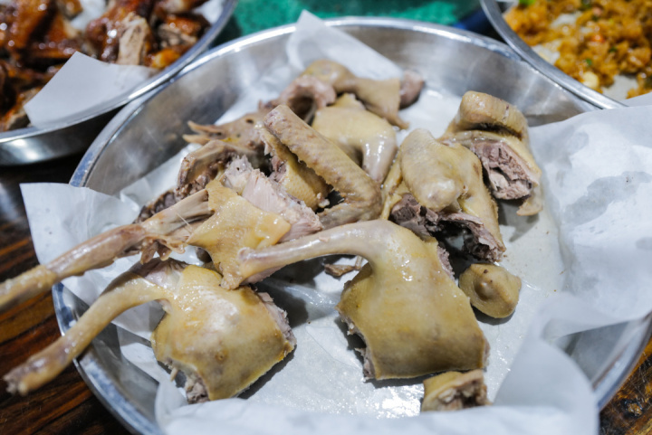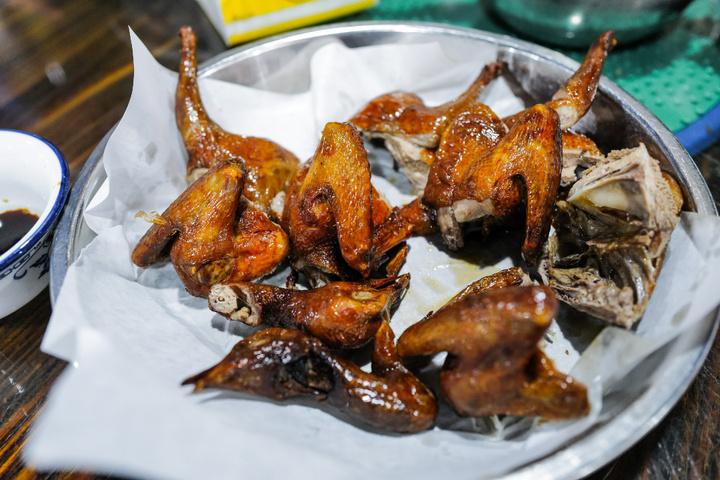 刚从油锅出来的乳鸽,颜色无比诱人,轻轻一撕,藏在鸽腿下满溢而出的肉汁,蛮多的。