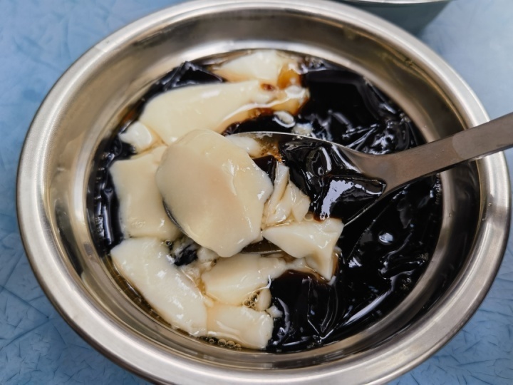 店里还在用不锈钢碗装豆腐花,4元一碗普通的豆花,还要什么自行车。我点了一份双拼,黑凉粉加白豆花还挺不错。