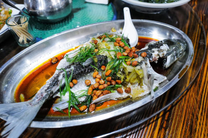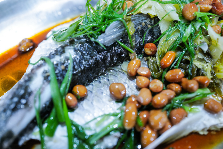 清蒸山坑鲩鱼,说是清蒸,实为葱油。鲩鱼其实就是草鱼,但不是西湖醋鱼的那种草鱼,而是被同行的“炊事兵”称为是拥有有海鱼般紧实肉质的草鱼,究其原因是该鱼从小吃蚕豆长大的。