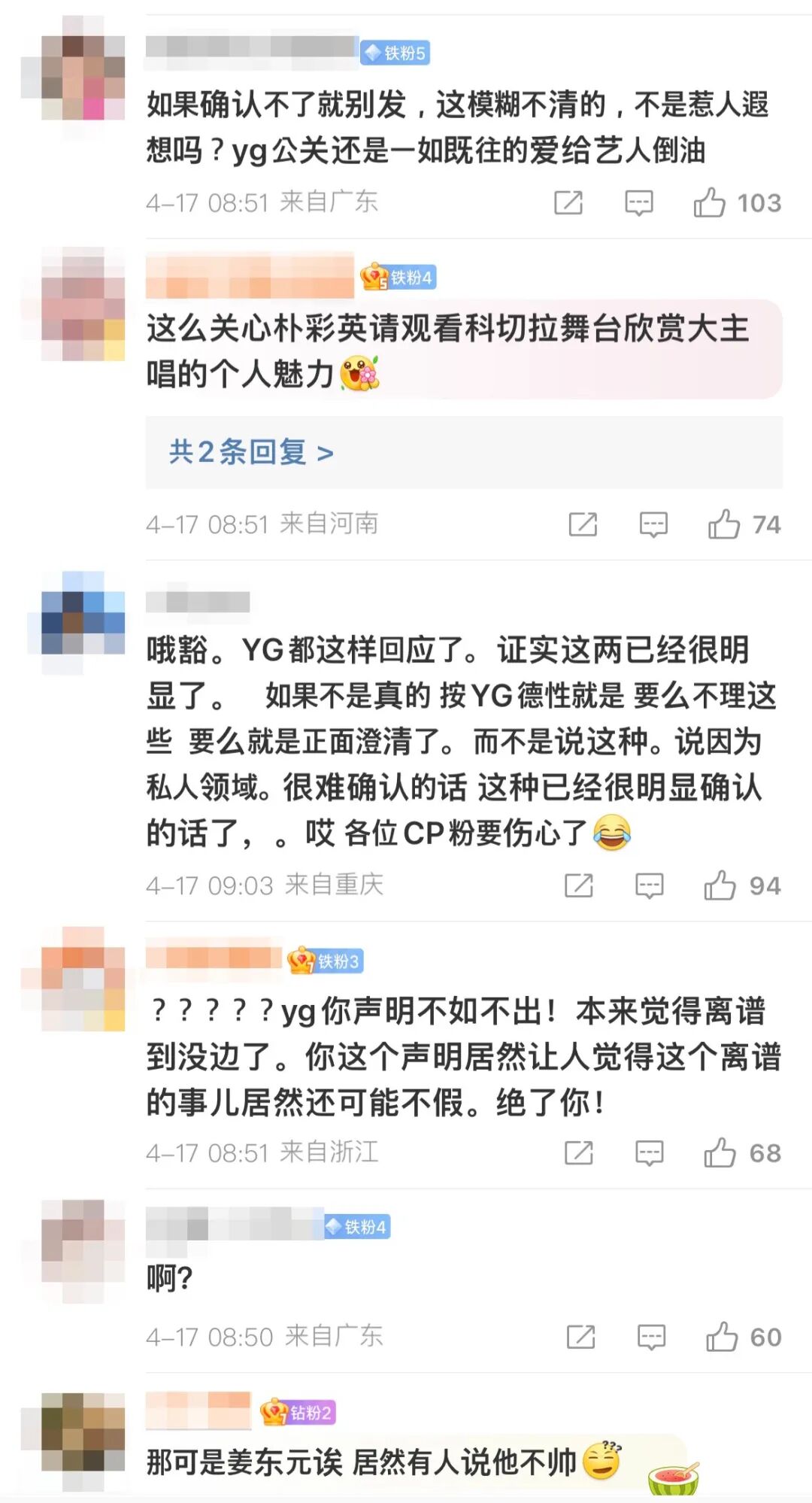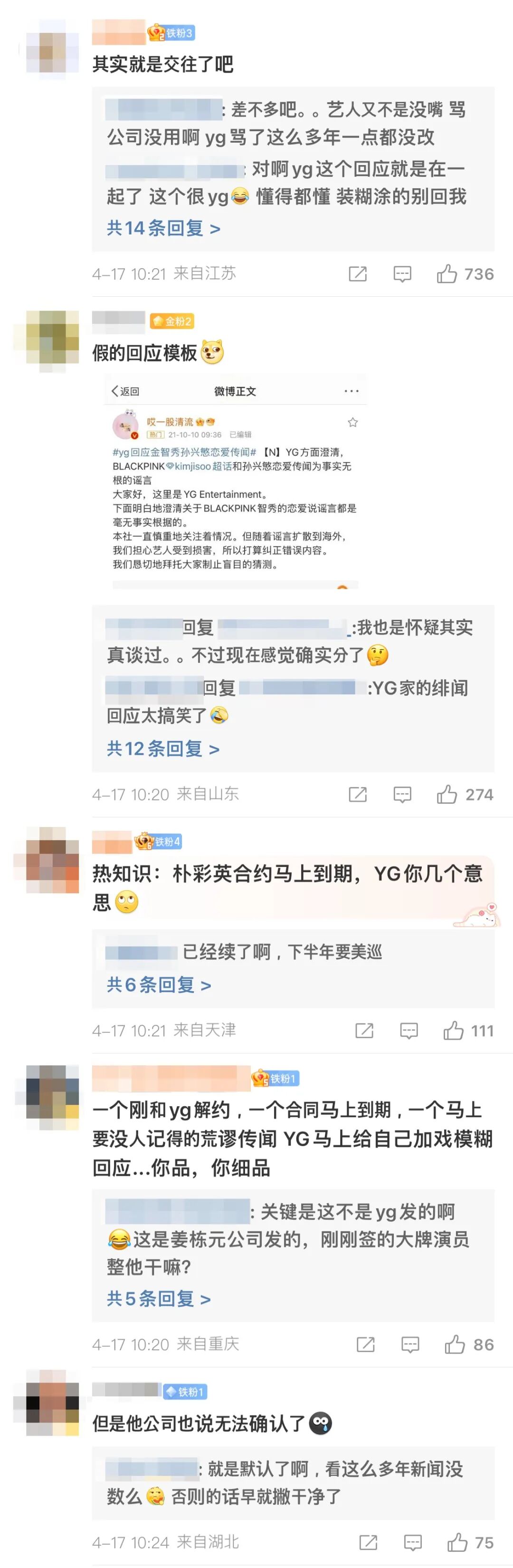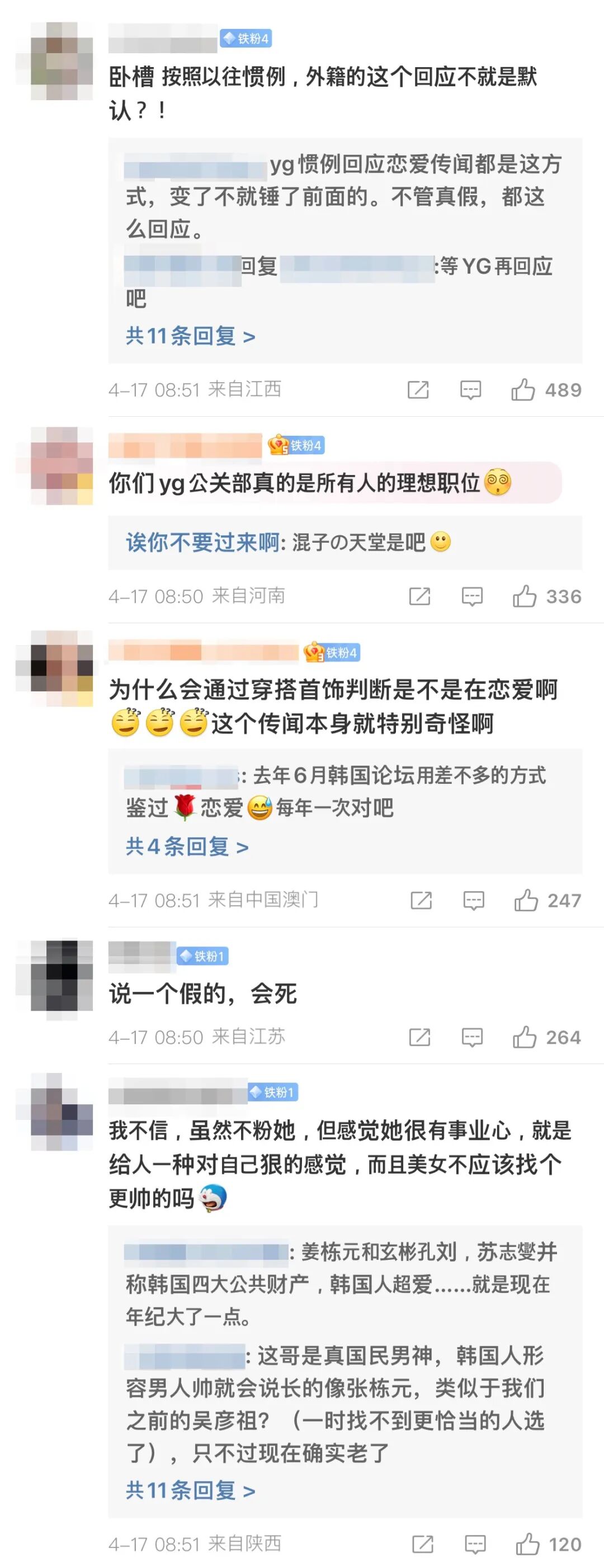 系。在官方回应新闻的评论,网友们对于恋情新闻和所属社“模糊”的回应,表达了自己的看法。有网友质疑传闻的可信度,也有网友则是吐槽了YG的回应方式一贯如此。同时也有相当数量的网友认为,基于双方公司的回应态度,参考过往经验,可以认为是默认了二人的恋爱关系。