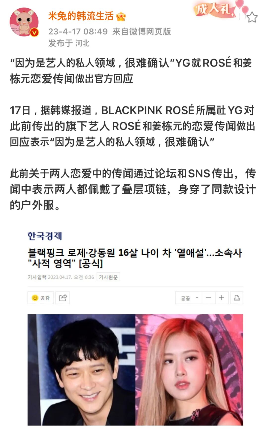 昨日,关于演员姜栋元和BLACKPINK成员ROSé疑似恋爱的消息快速登上各大平台头条,引发中韩网友们的广泛讨论。
