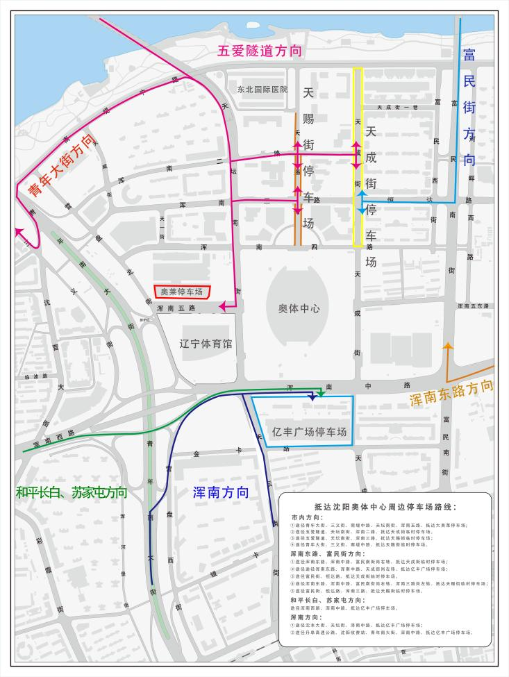 在沈阳奥体地区道路设置停车区域6处,预计可停放车辆约5000台;同时设置备用停车场2处。
