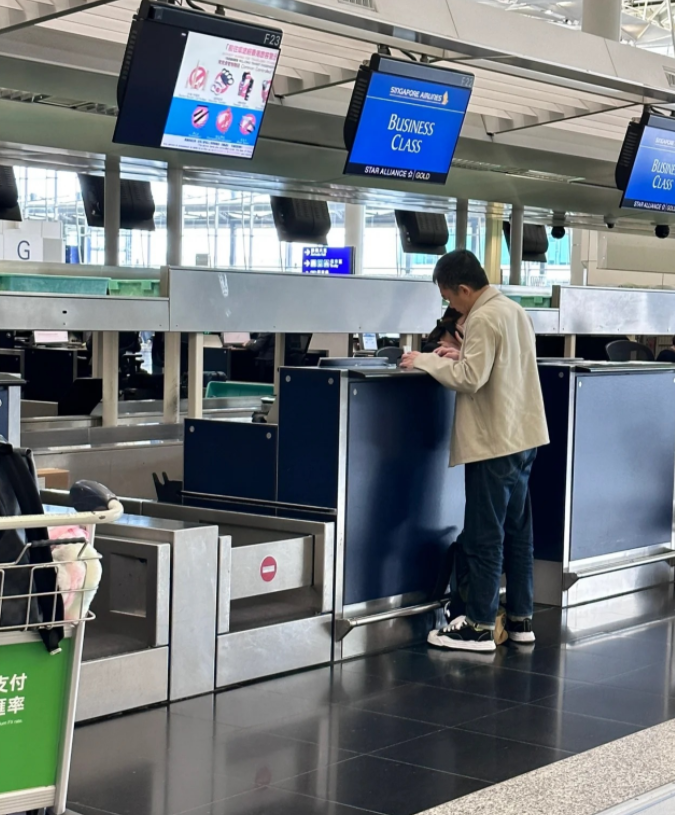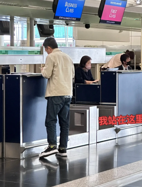 拍完照片后,梁朝伟站在值机台前继续忙着办理值机手续,看上去很认真仔细,似乎像是在填写相关出国的资料信息。