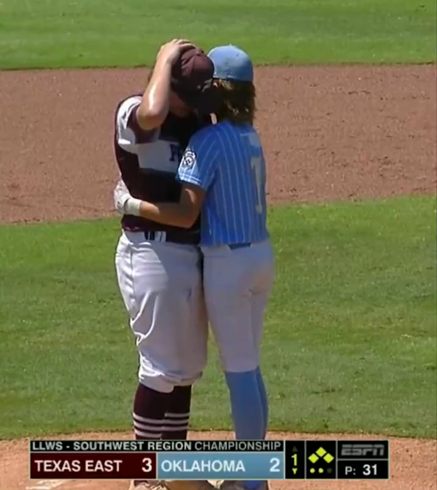 很多时候,一时一刻的输赢也比不上孩子间的关心和鼓励。俄克拉荷马州的一次棒球联赛上,一位小击球手不巧被击中头盔,当场摔倒。作为对手的小投球手又懊悔又难过。但击球手爬起来后,却拥抱住了自己的对手,告诉他:“你投得真棒!”比赛中,他们是对手,但比赛之外,孩子们更是朋友。有什么比这更暖心呢?