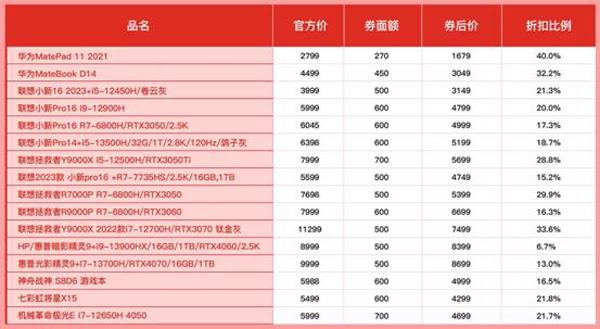 此外,官方价为5499元的七彩虹将星X15券后价为4299元,补贴力度超过21%;官方价为5999元的机械革命极光E i7-12650H 4050券后价为4699元,补贴力度超过21%;官方价为5988元的神舟战神 S8D6 游戏本,券后价为4999元。