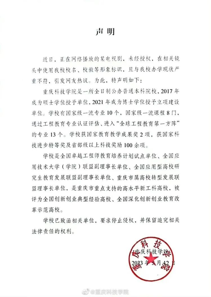 5月12日晚,重庆科技学院发布声明称,电视剧,未经授权,在相关镜头中使用重庆科技学院校名、校徽等形象标识,且与学校办学现状严重不符,引发网友热议。学校已致函相关单位,要求停止侵权,并保留追究相关法律责任的权利。