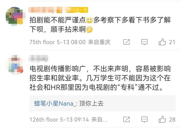 也有网友留言:“电视剧传播影响广,不出来声明,容易被影响招生率和就业率。”