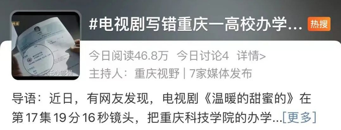 近日,有网友发现,电视剧《温暖的甜蜜的》在第17集19分16秒镜头,把重庆科技学院的办学层次写成了专科,不少该校学生表示:“难以接受,看个电视剧成大专生了。”