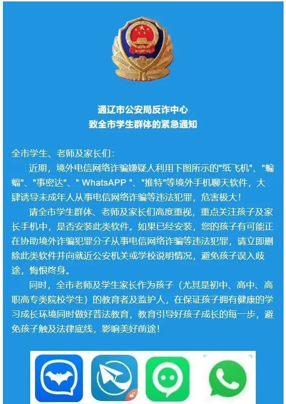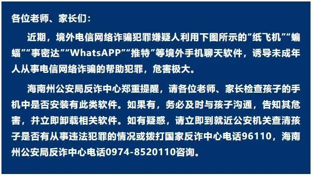 近期,公安机关发现,有境外电信网络诈骗犯罪嫌疑人,利用手机聊天软件诱导未成年人从事电信网络诈骗帮助犯罪,危害极大,请各位老师、家长及时检查孩子手机中是否安装有以下软件↓↓↓