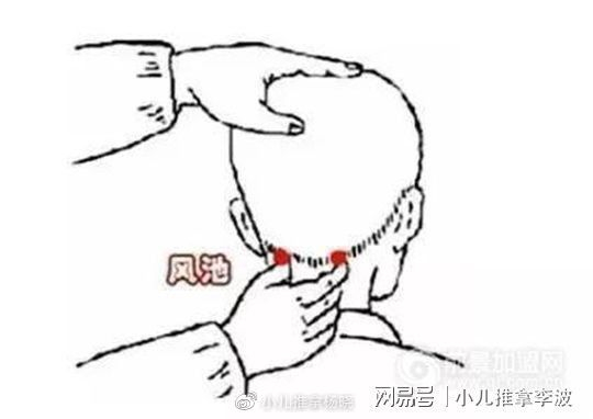 术者右手拇、食二指同时拿孩子 后发际两侧凹陷处,拿5~10次。