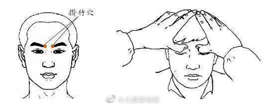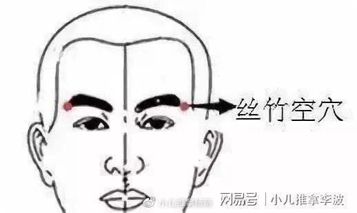 丝空竹,在面部,当眉梢凹陷处。 术者拇指或食指按揉之,按3~5 次,揉30~50次。