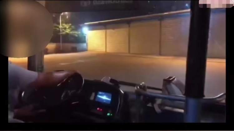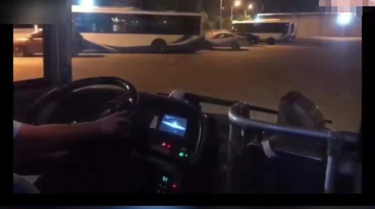 从视频中可以看到,夜色中的公交停车场内(上南公交),一辆公交车内有人正开着车,还有人声传出:“这个车今天要被我们玩坏了。”“啊,当心当心!”“你刚才差点把人撞到。”“当心当心,开远光灯开远光灯!”