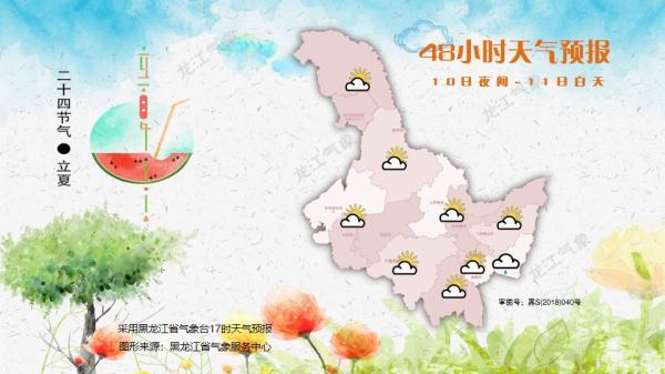 10日白天最高气温:大兴安岭、佳木斯西部、牡丹江西部19~21℃,其它地区16~18℃。
