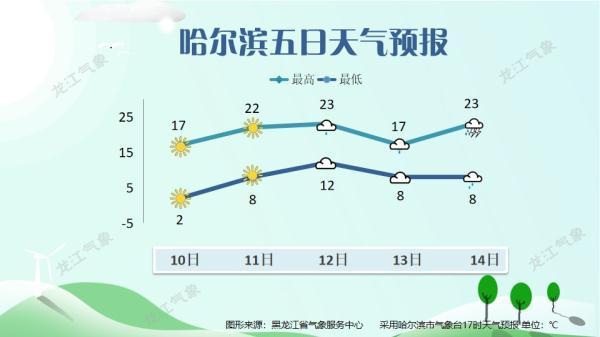 11日夜间至12日白天:11日夜间全市多云,12日白天西部区域(双城、主城区、呼兰)阵雨,东部区域多云;西南风3~5级;最低气温4~7℃,最高气温22~23℃。