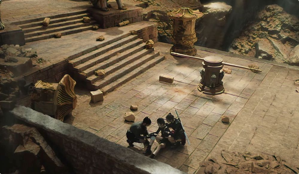 至于电影的制作要多敷衍有多敷衍,各种特效画面只能远观不能近看,电影开篇突出的古墓画面,塑料感极强,明显的绿幕抠图即视感,就跟把人物P进了手游画面一样,相当突兀。