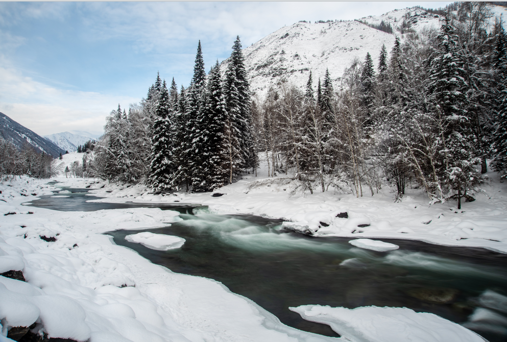雪峰、森林、草地、河流
