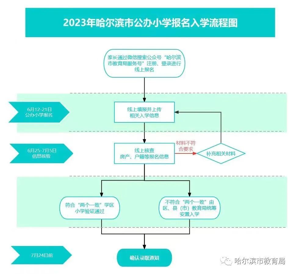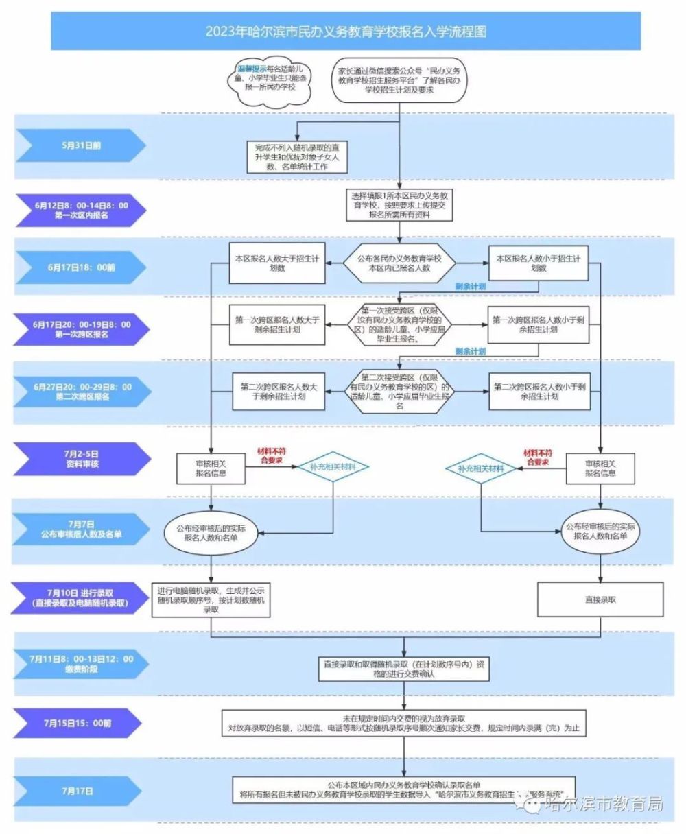 3.统一网上报名。6月12日-21日,进行网上报名、信息采集。符合入学条件的适龄儿童家长,须在“哈尔滨市义务教育招生入学服务系统”进行入学报名并上传相关入学信息。报名信息采集不得要求提供学前教育经历、计划生育证明、超过正常入学年龄证明等无谓证明材料;预防接种证明不作为入学报名前置条件,可在开学后及时要求学生提供。应当采集学生基本信息、家庭住址及家长姓名、联系方式等必要信息,严禁采集学生家长职务和收入信息。信息采集工作应在招生入学时一次性采集,不得利用各类APP、小程序随意反复采集学生相关信息。7月17日,所有报名但未被民办小学校录取的学生数据导入“哈尔滨市义务教育招生入学服务系统”。7月18日-19日,对报名民办小学但未被录取的适龄儿童信息进行补充。